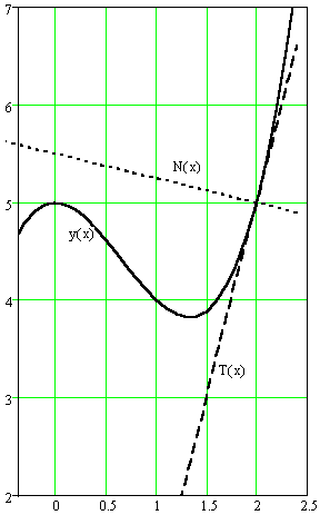 Here's the graph of the tangent and normal to the curve at `x=2`.