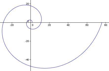 A Golden Spiral has the characteristic such that for every quarter turn (`90^@` or `π/2` in radians), the distance from the center of the spiral increases by the golden ratio `Phi = 1.6180`.