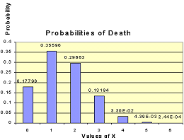 Here, `n = 6` and `x = 4`. Let `p = 0.25` (success, that is, they live), `q = 0.75` (failure, i.e. they die).
