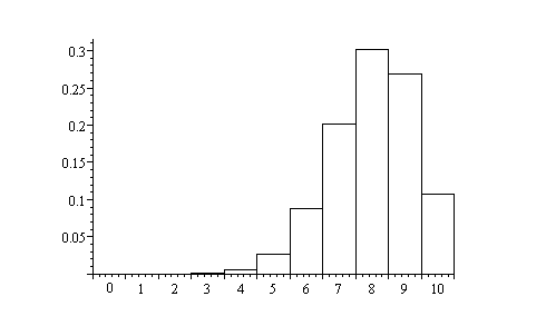 Using the function `g(x)=C(10,x)(0.12)^x(0.88)^(10-x)` and finding the values at `0, 1, 2, ...`, gives us the histogram: