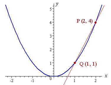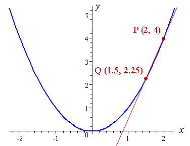 Now we move Q further around the curve so it is closer to P. Let's use `Q(1.5,2.25)` which is closer to `P(2,4)`: