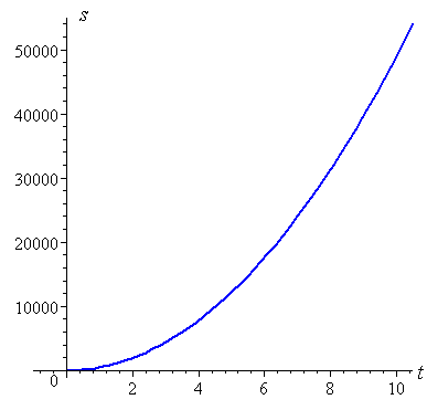 Here is the graph of s (displacement) against time (in seconds) . We see that the velocity (equivalent to the slope of the tangent of the curve) is not constant. At the beginning, the slope is `0` (the curve is horizontal, or momentarily flat). As time goes on, the object speeds up, and the slope of the curve gets steeper (more vertical), as we can see in the light grey tangent lines.