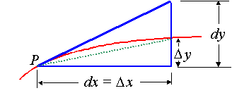 The slope of the dashed line is given by the ratio `(Delta y)/(Delta x).` As `Delta x` gets smaller, that slope becomes closer to the actual slope at P, which is the "instantaneous" ratio `dy/dx`.