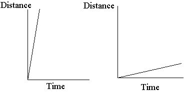 If we have a high velocity, the graph has a steep slope. If we have a low velocity the graph has a shallow slope (assuming the vertical and horizontal scale of each graph is the same).