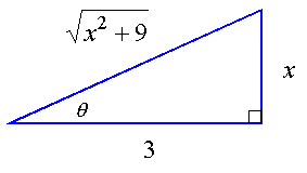 Triangle to find `theta`, `sin theta` and `cos theta` in terms of `x`.