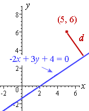 Find the perpendicular distance from the point (5, 6) to the line −2x + 3y + 4 = 0, using the formula we just found.