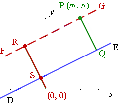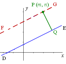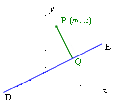 We have a point P with coordinates (m, n). We wish to find the perpendicular distance from the point P to the line DE (that is, distance `PQ`).