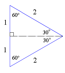 Take the top half only. The unknown side is the `sqrt(3)` and the `30^@` and `60^@` angles are as indicated: