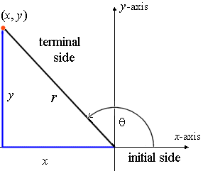 Also, note that `sin theta` is defined as `y/r`, and `cos theta` is defined as `x/r` and `tan theta` is defined as `y/x`.