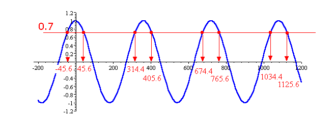 Of course, there are an infinite number of angles where the cosine of the angle is `0.7`. Here are some of them (the values where the pink arrows are pointing):