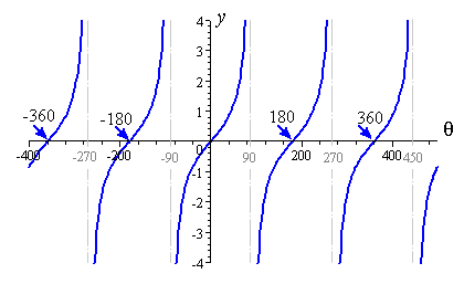 Let's see what the graph of y = tan θ looks like. We see that there is a regular pattern that recurs every `180^@`. There are also "gaps" in the curve (at `90^@`, `270^@`, ...) where tan θ has no finite value. (Try it on your calculator - see what it says if you try to find the value of `tan 90^@`.)