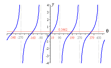 Likewise, tan 379.096o = 0.3462. And some negative angles also work: tan (-160.904o) = 0.3462.