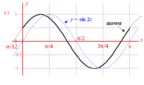 The curve `y=sin(2x)` is shown as grey dashed, and the answer, shifted by `pi/12` to the left, is in dark green.