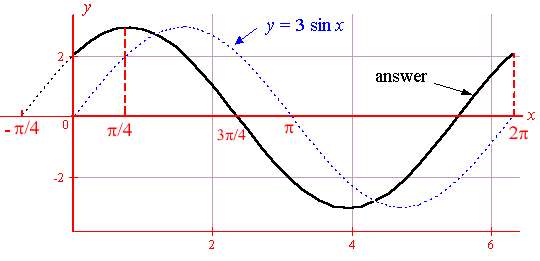 The curve `y=3sin(x)` is shown as grey dashed, and the answer, shifted by `pi/4` to the left, is in dark green.