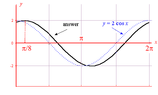 This means we need to move y = 2 cos x to the right by ` π/8.`