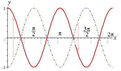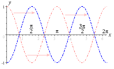 So we have to shift every point on the curve to the right (because phase shift is a positive number) by `pi/2`. This give us y = cos(2x - π), the blue dotted curve.