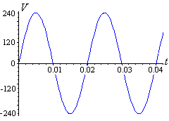 In the UK, electricity is supplied at 240 V, 50 Hz. The graph of this voltage has a period of 0.02 sec and an amplitude of 240 V.